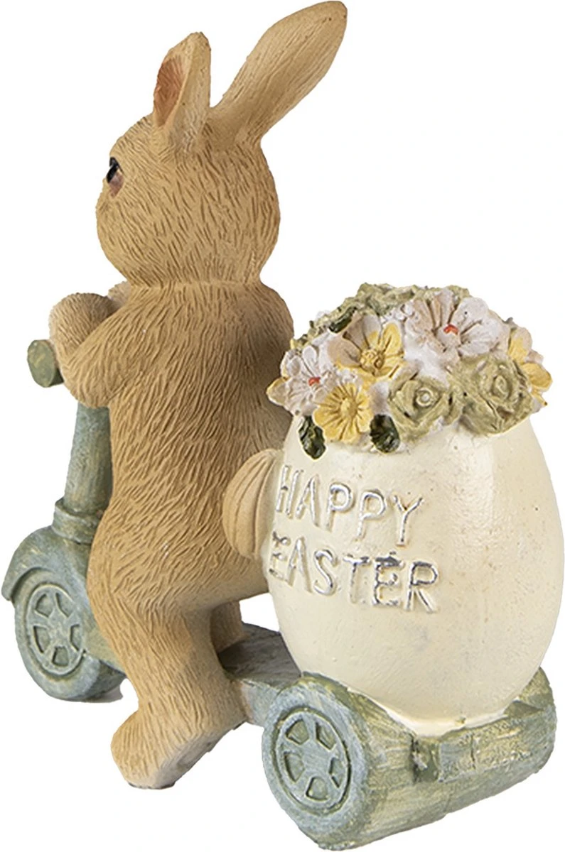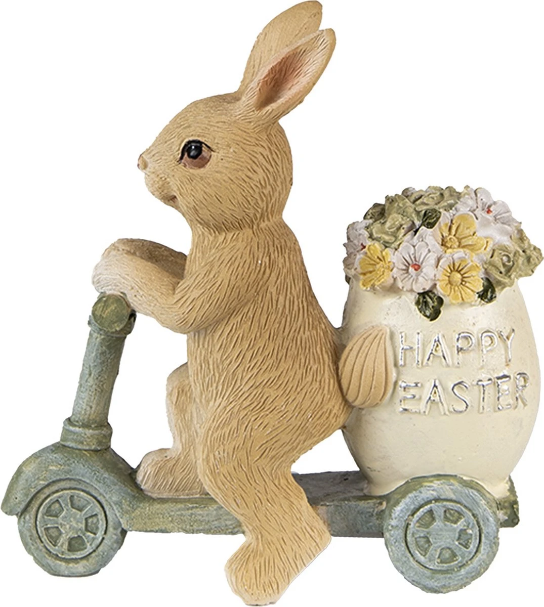 Decoratief kleurrijk beeldje van een konijn op autoped, met achterop een ei versierd met bloemen, en de tekst Happy Easter, in een landelijke stijl, van het merk Clayre & Eef. Afmeting 11x5x11 cm.Woonaccessoires Paashaas Pasen