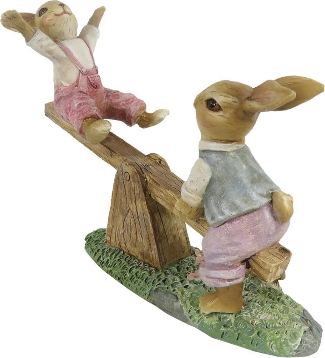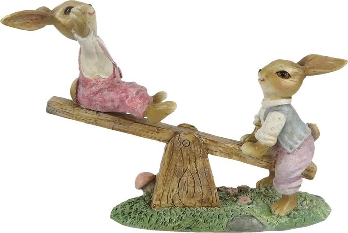 Beeld van twee konijntjes op een wip-wap van het merk Clayre & Eef Leuke decoratie voor Pasen, mooie paasdecoratie, paashaas. Woonaccessoires Pasen Paashaas