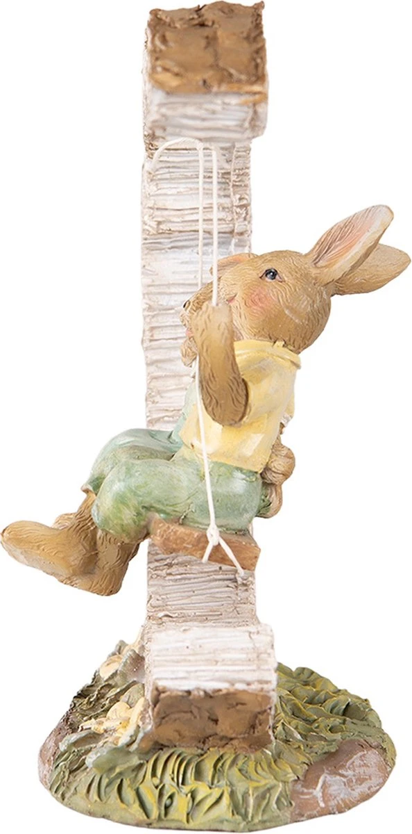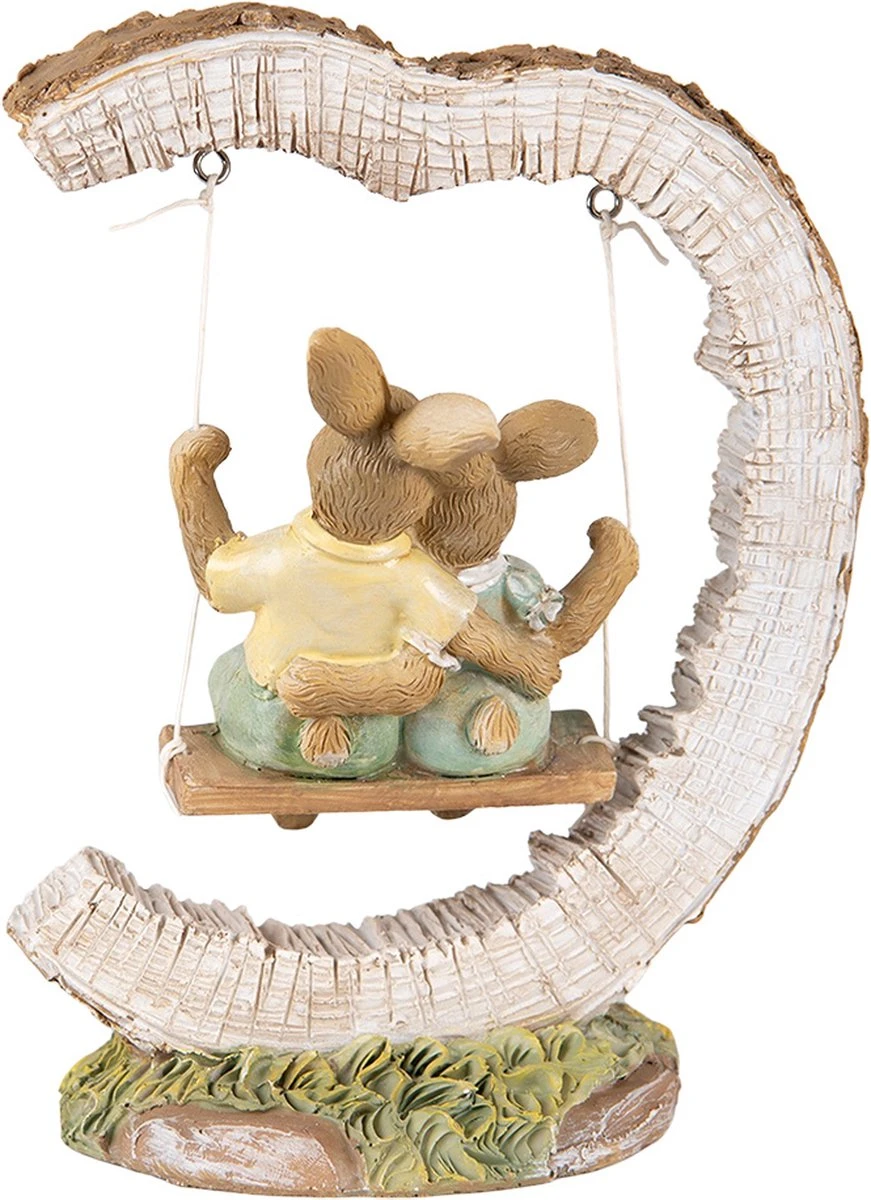 Decoratief bruin met groen beeldje van twee konijnen op een schommel, in een landelijke stijl, van het merk Clayre & Eef. Ook leuk als decoratie voor Pasen. Afmeting 13x7x16 cm. Woonaccessoires Paashaas Pasen