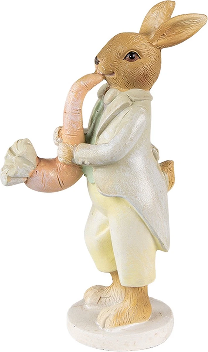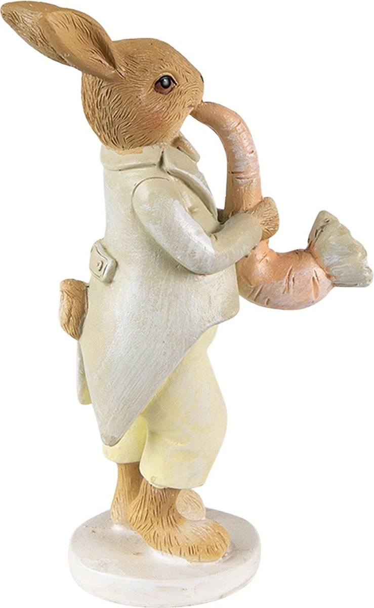 Decoratief kleurrijk beeldje van een konijn in een kostuum, met een wortel tussen zijn poten, in een landelijke stijl, van het merk Clayre & Eef. Ook leuk als decoratie voor Pasen. Afmeting 5x8x16 cm.Woonaccessoires Paashaas Pasen