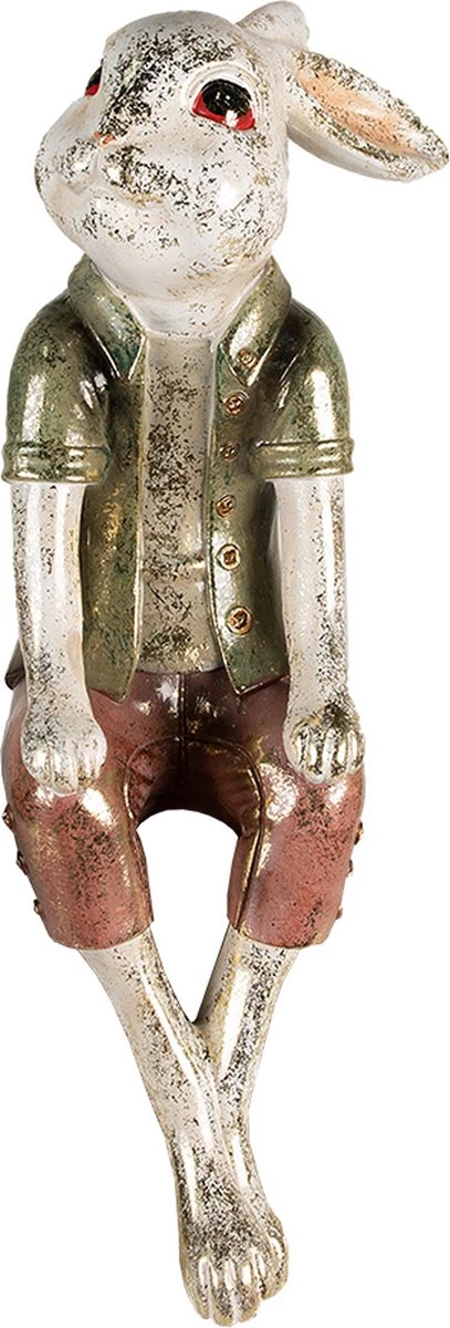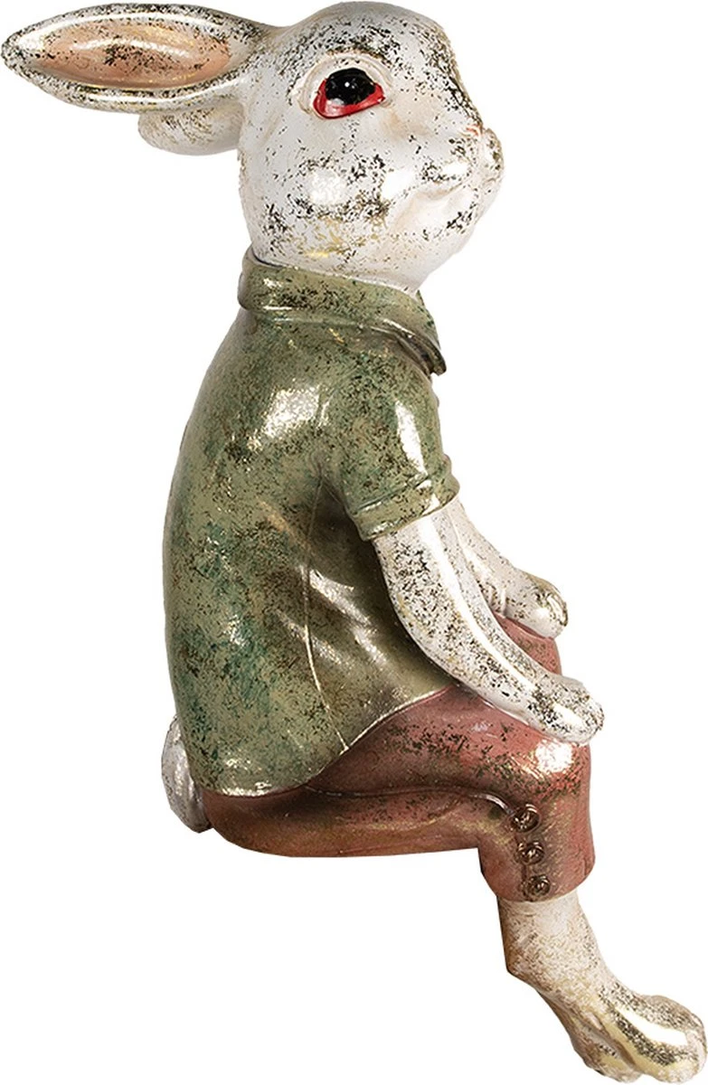 Mooi decoratief beige beeld van een zittend konijn (Leuk voor op de rand van een kast of een schap), met een groene blouse en een rode broek, in een klassieke stijl. Ook leuk als decoratie voor Pasen.Woonaccessoires Paashaas Pasen