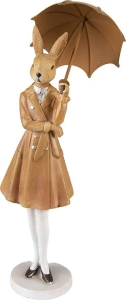 Decoratief kleurrijk beeldje van een konijn in een bruine jas en met een bruine paraplu, in een landelijke stijl, van het merk Clayre & Eef. Ook leuk als decoratie voor Pasen. Afmeting 10x10x28 cm. Woonaccessoires Paashaas Pasen