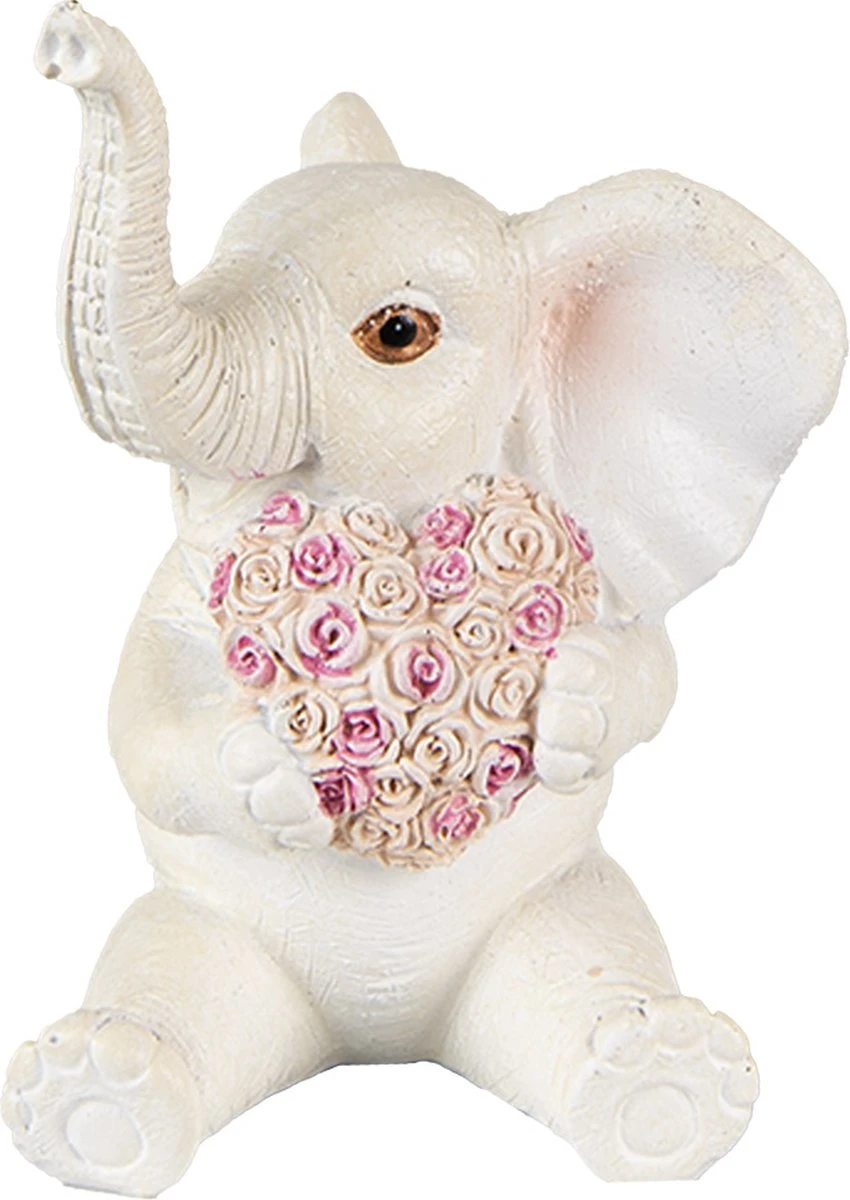 Decoratief wit beeldje van een zittende olifant met een hart van roze bloemen, in een landelijke stijl met een romantische uitstraling, van het merk Clayre & Eef. Afmeting 8x6x10 cm.Woonaccessoires beeld decoratie Decoratieve Accessoires