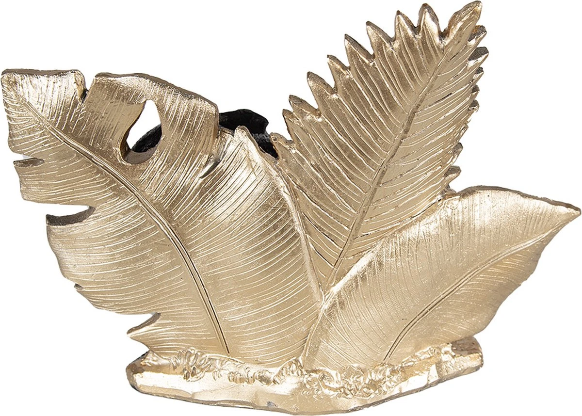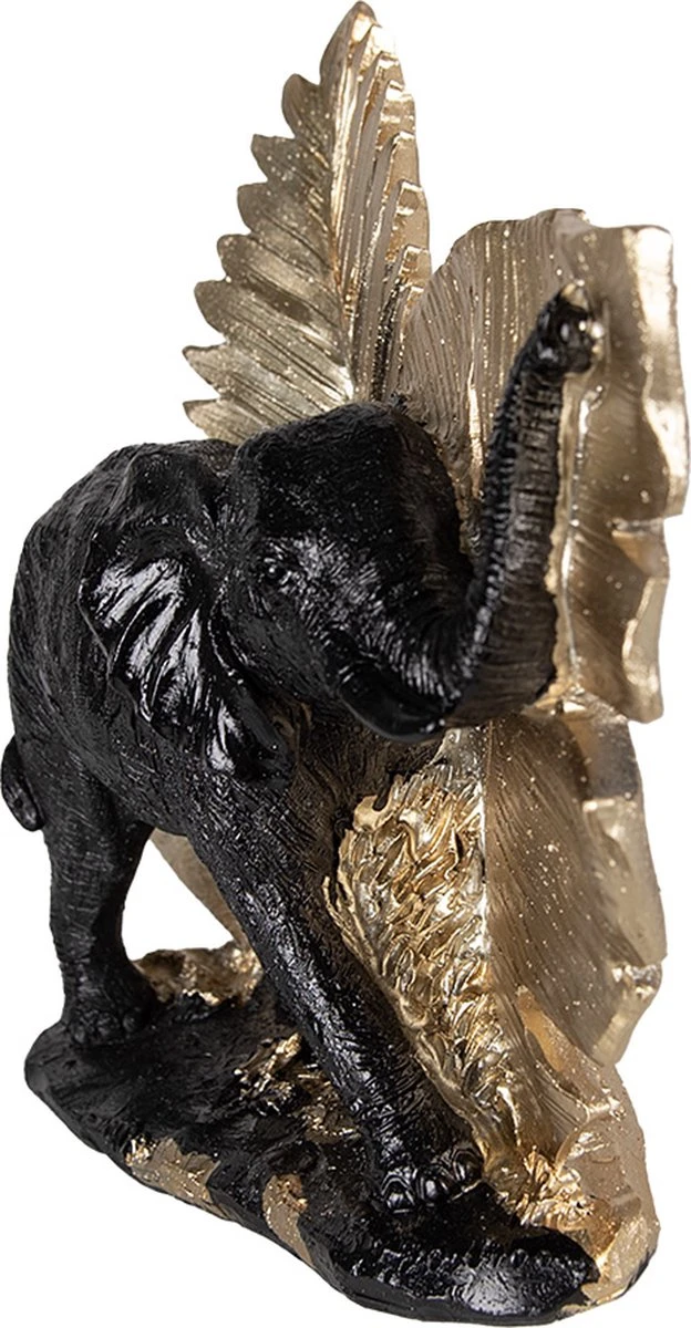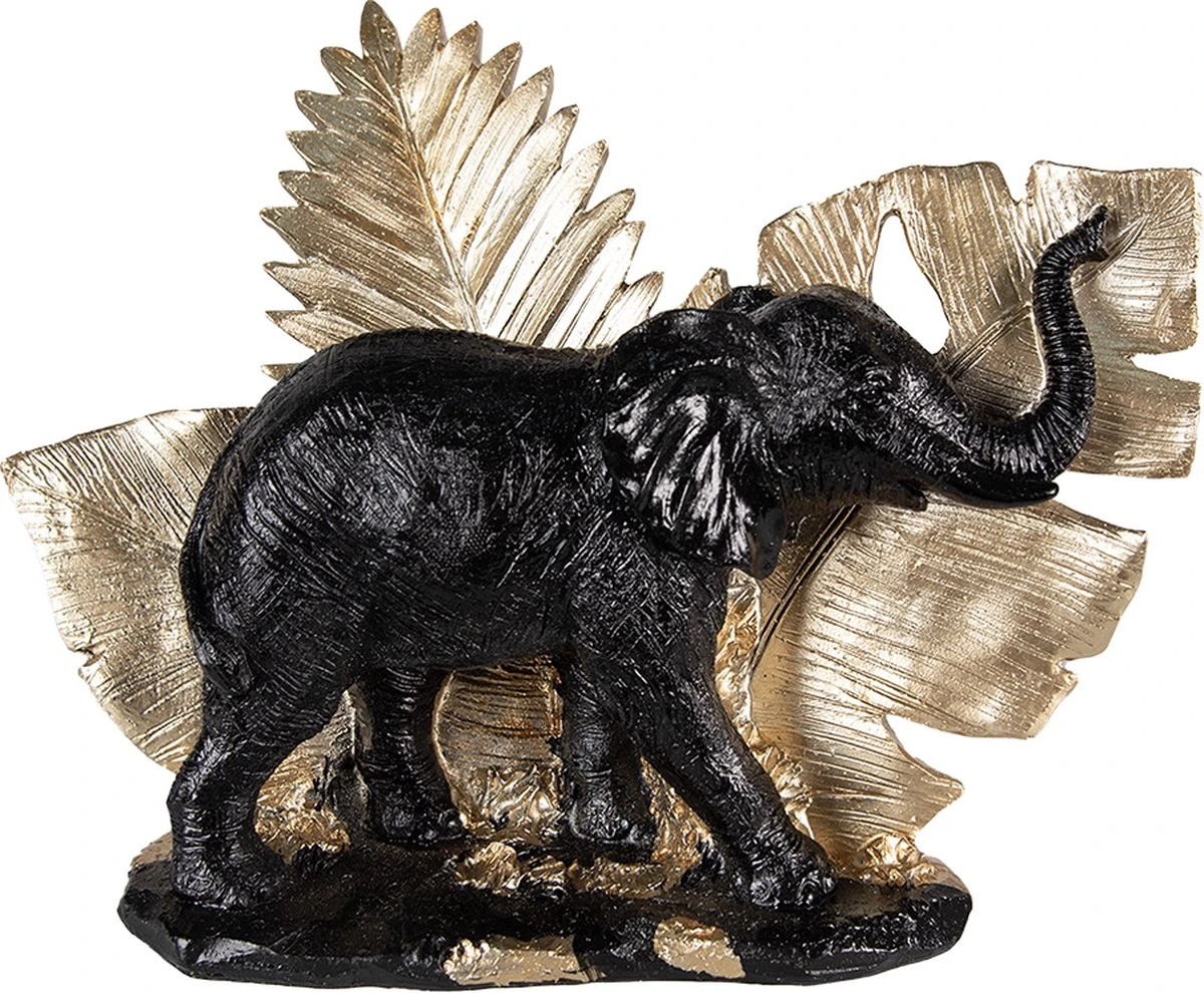 Decoratief zwart beeldje van een olifant met op de achtergrond een goudkleurige decoratie in de vorm van bladeren, in een moderne stijl, van het merk Clayre & Eef. Afmeting 25x10x18 cm.Woonaccessoires beeld decoratie Decoratieve Accessoires