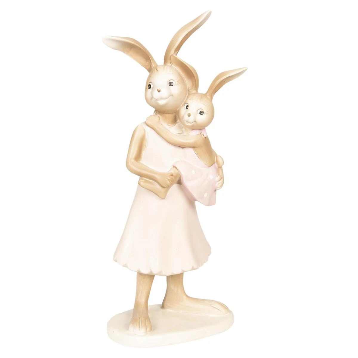 Beeld van een bruine rechtopstaande haas in een lichtroze jurkje met een jong haasje in haar armen van het merk Clayre & eef Leuke decoratie voor Pasen, mooie paasdecoratie, paashaas.
