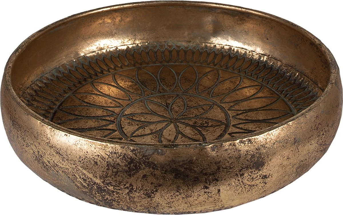 Decoratief goudkleurig, rond, metalen dienblad, in een retro stijl, met een vintage uitstraling, van het merk Clayre & Eef.Serveerschaal