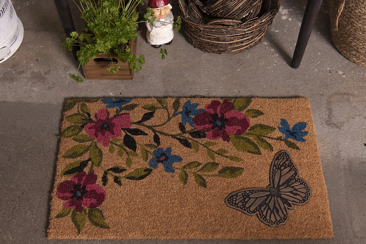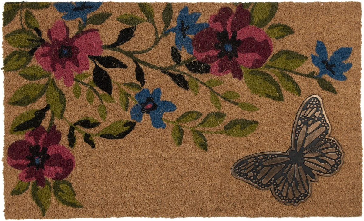 Kokosvezel deurmat met vlinder en kleurige bloemetjes erop Van het merk Clayre & Eef. Kokosmat Mat Schoonloopmat