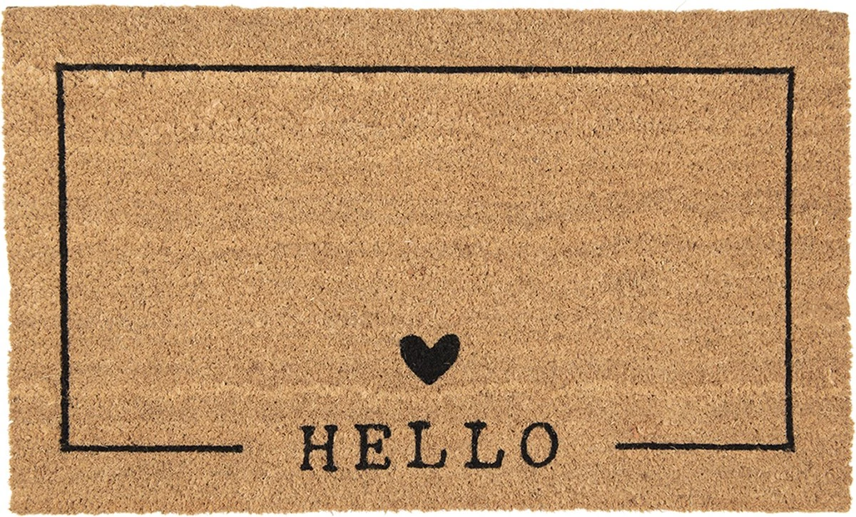 Bruine deurmat met een hartje erop en de tekst Hello, van het merk Clayre & Eef. Kokosmat Mat Schoonloopmat
