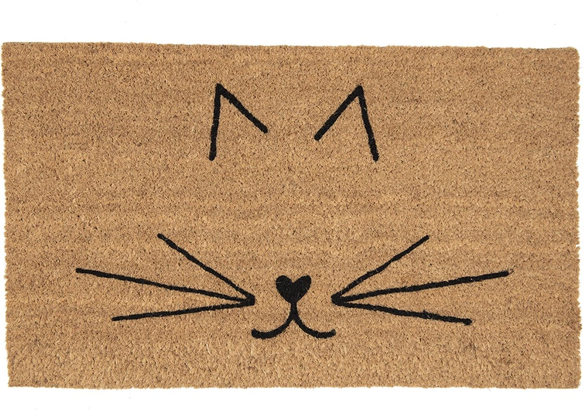 Bruine deurmat met een motief van een kat erop, van het merk Clayre & eef. Kokosmat Mat Schoonloopmat