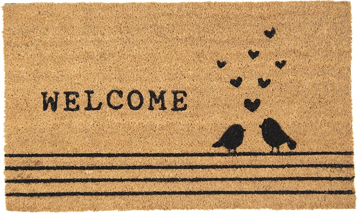Bruin deurmat gemaakt van kokosvezel met een motief van vogeltjes en hartjes en de tekst Welcome erop, van het merk Clayre & Eef. Kokosmat Mat Schoonloopmat
