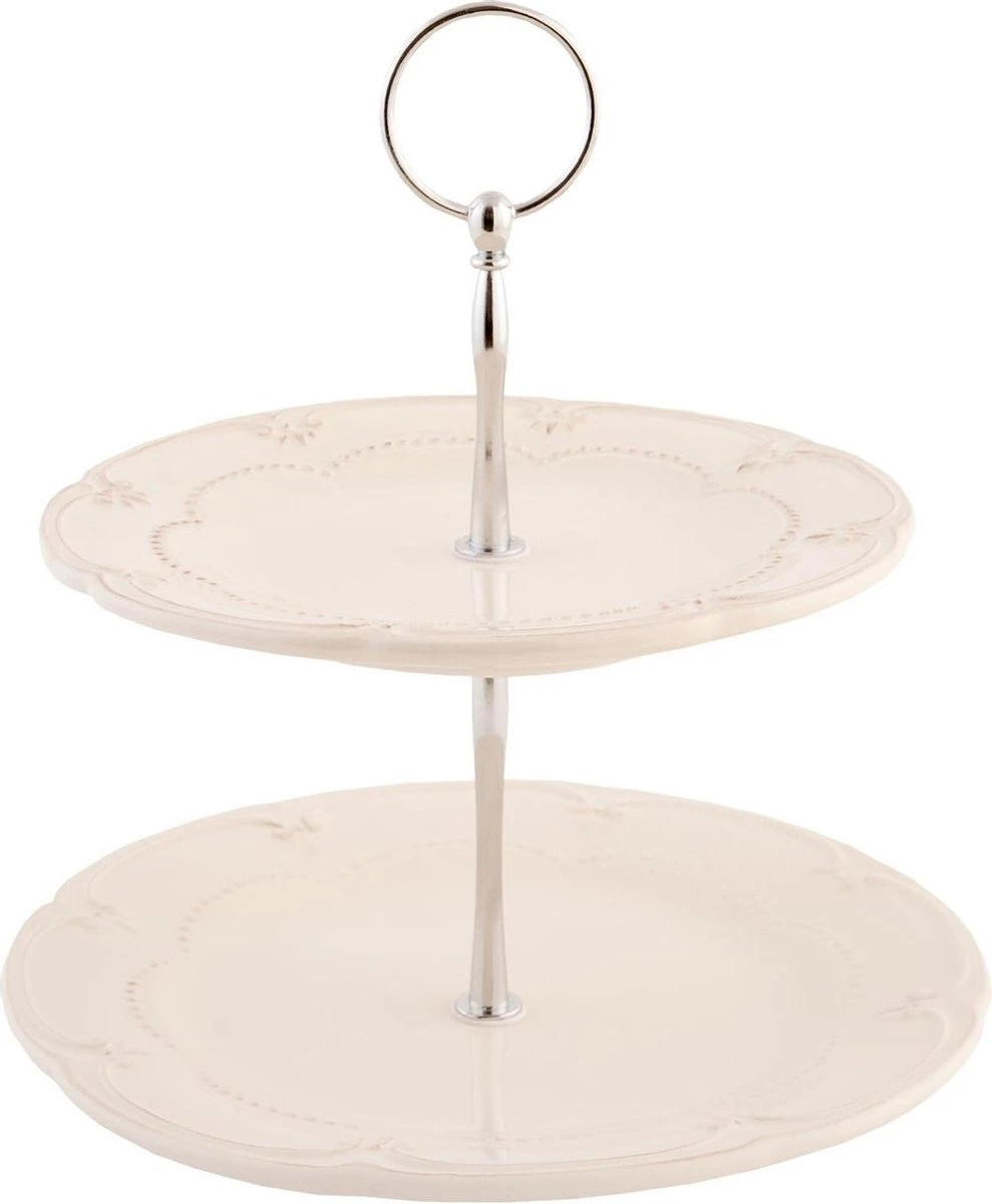 Klassiek Landelijk Beige Etagère 2 laags Taartplateau Serveerschaal Roosjes Keramiek Rond