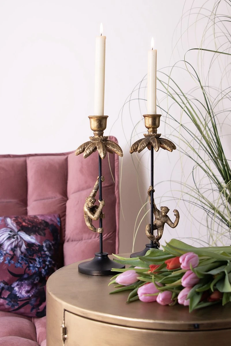 Decoratieve goudkleurig met zwarte kandelaar, in de vorm van een palmboom, met halverwege de stam een beeldje van een aap, in een vintage stijl. Geschikt voor een kaars met een doorsnede van 2 cm. Afmeting Ø 11*32 cm. Kaarsenstandaard Kaarsenhouder