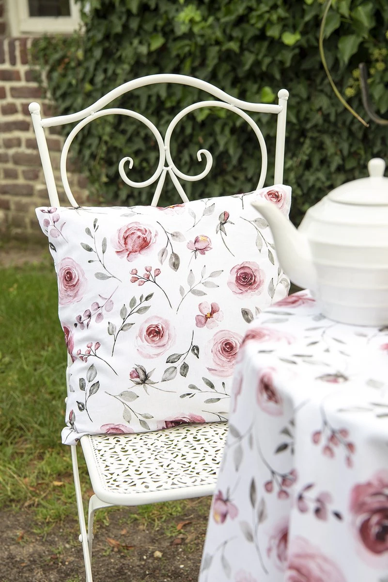 Deze serie met rozen in een oudroze kleur, geeft een rustiek karakter. De kleuren op de witte ondergrond maken dit tot een fris en kleurrijk geheel. Met items als tafellakens, placemats, servetten en broodmandjes, wordt elke tafel omgetoverd tot een romantische setting. Keukenschorten, keukendoeken, pannenlappen en ovenhandschoenen creëren dezelfde sfeer in de keuken. De bijpassende stoelkussens en kussenhoezenzorgen niet alleen voor het nodige zitcomfort, maar tevens voor kleur aan de keukentafel.