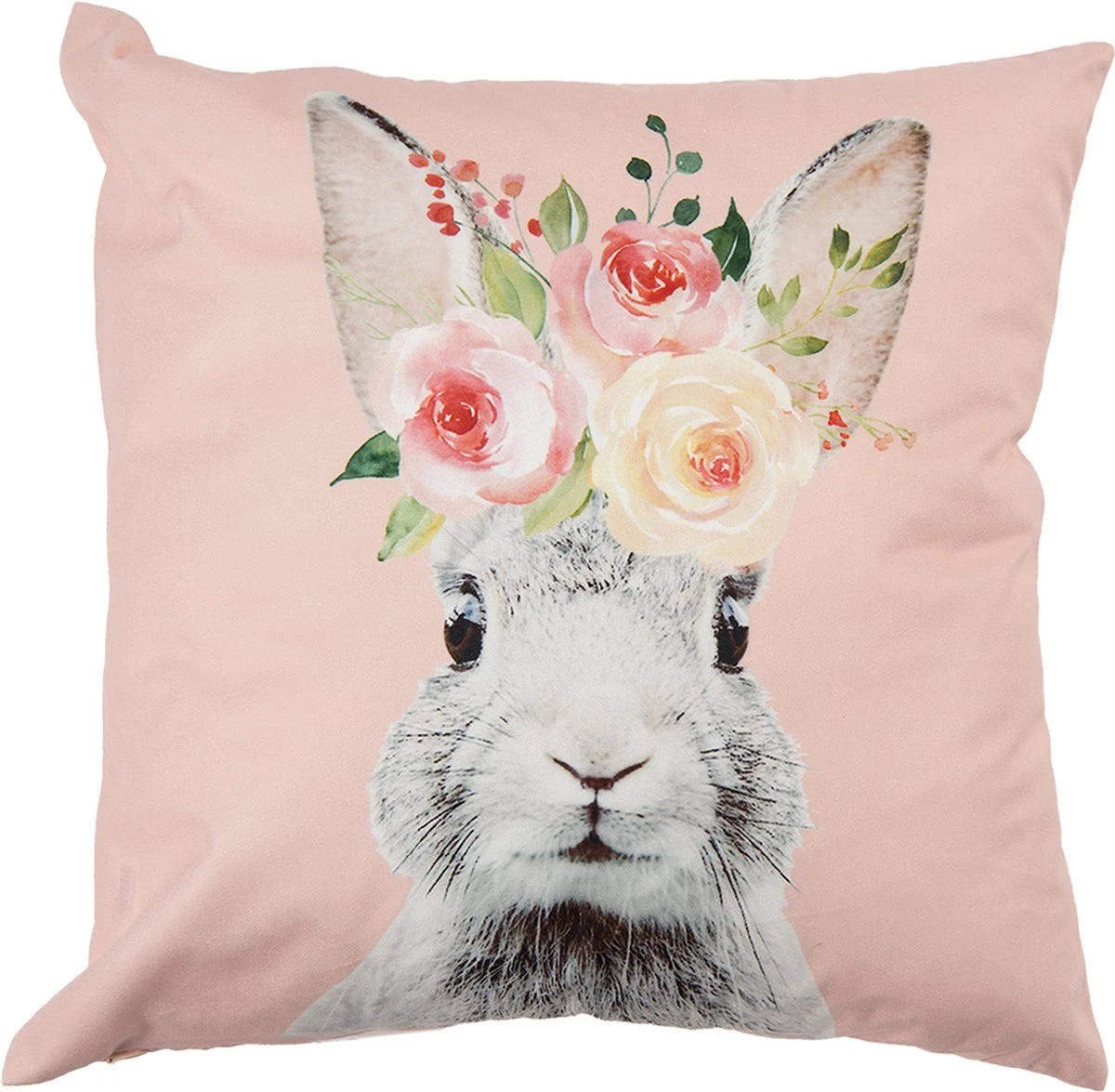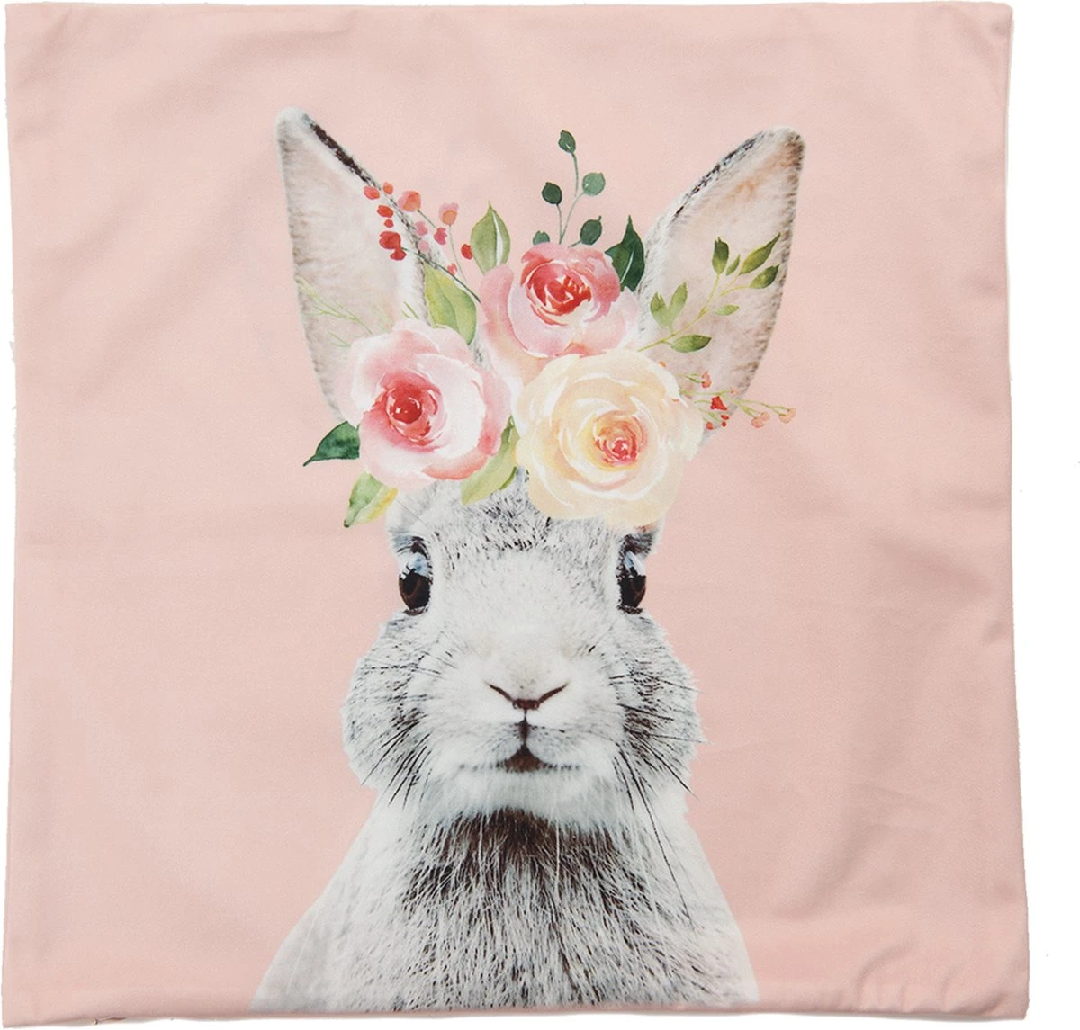 Roze kussenhoes met een grijs konijn met bloemen op het hoofd gemaakt van 100% Polyester