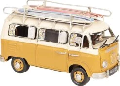 Vintage staand ijzeren geel-wit VW camper-busje met imperiaal met surfboarden voor decoratie van het merk Clayre & Eef Miniatuur VW Bus Miniatuur Auto