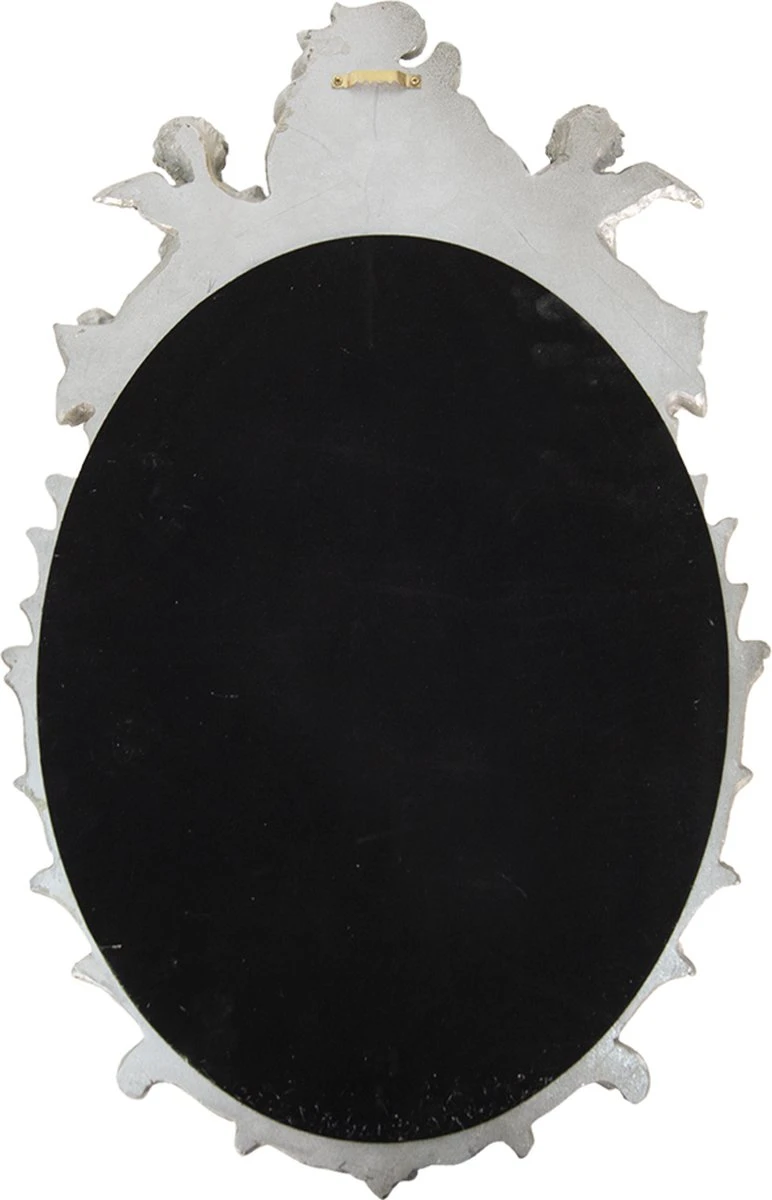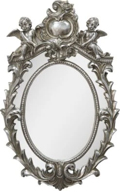 Zilverkleurige klassiek landelijke wandspiegel met mooi bewerkte rand met engelen en krullen, van het merk Clayre & Eef.