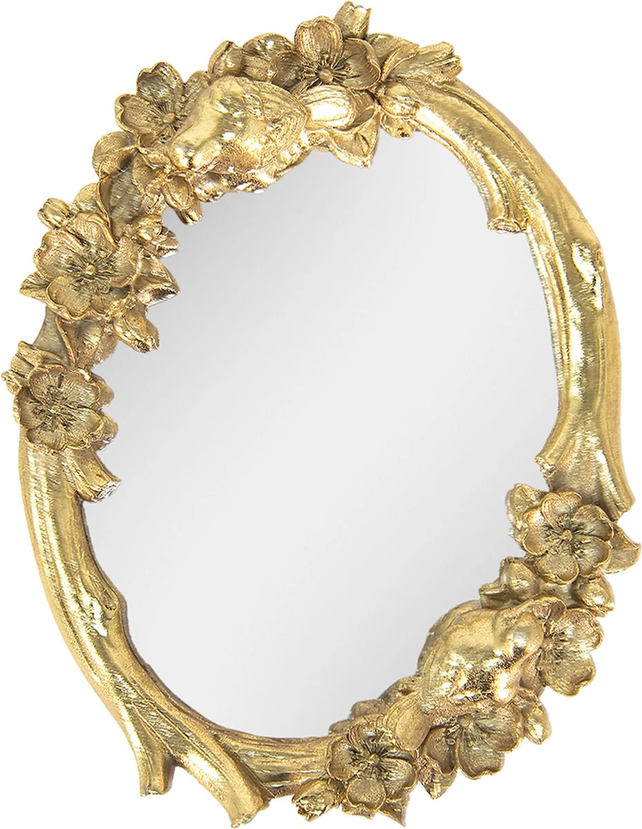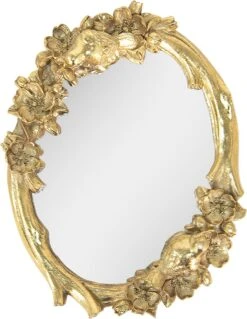 Goudkleurige vintage romantische wandspiegel met mooi met bloemen bewerkte rand, van het merk Clayre & Eef.
