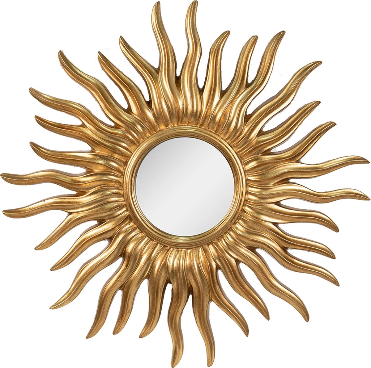 Landelijk, goudkleurige spiegel in de vorm van een zon van het merk Clayre & Eef.De diameter van de spiegel is 17 cm.