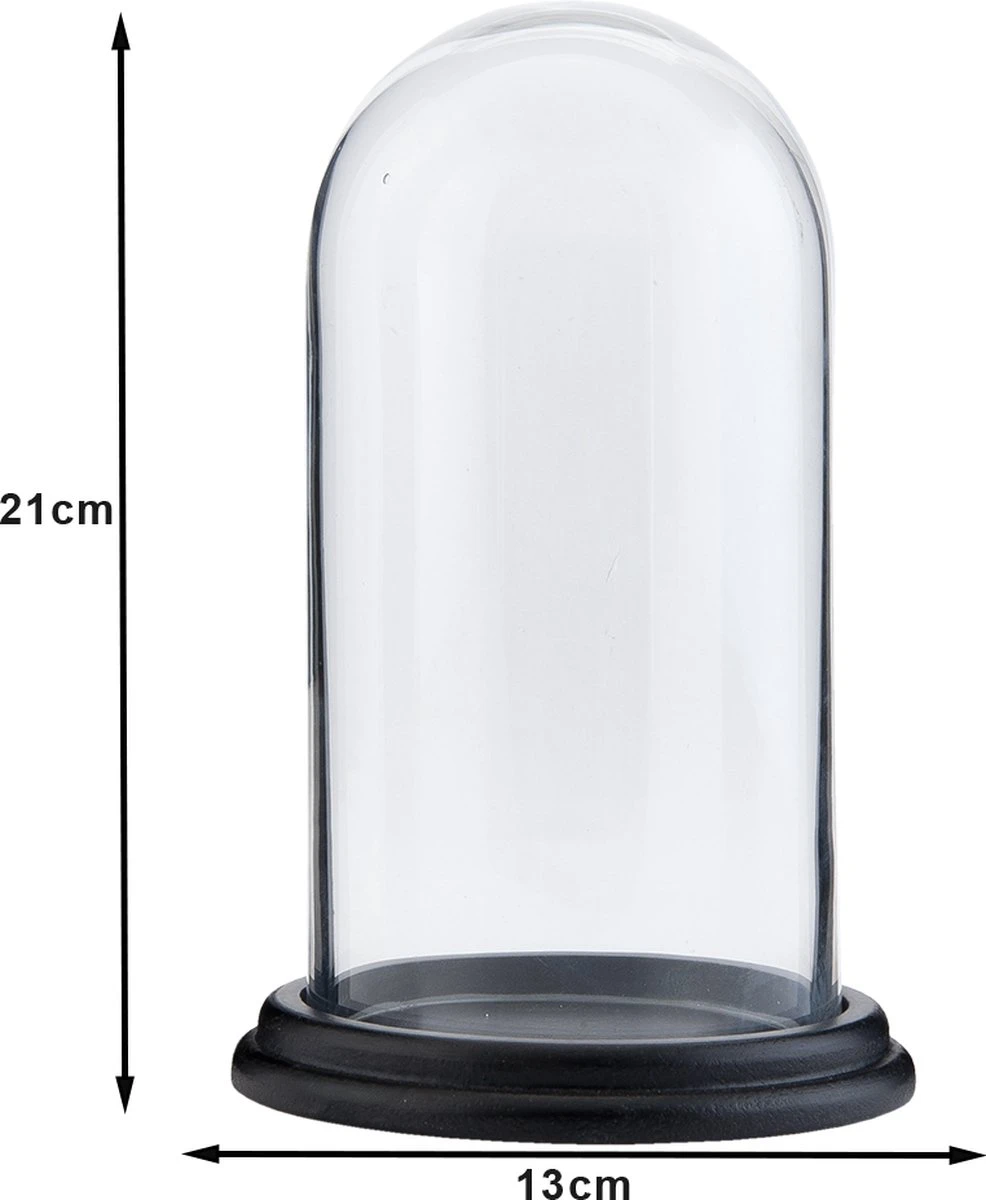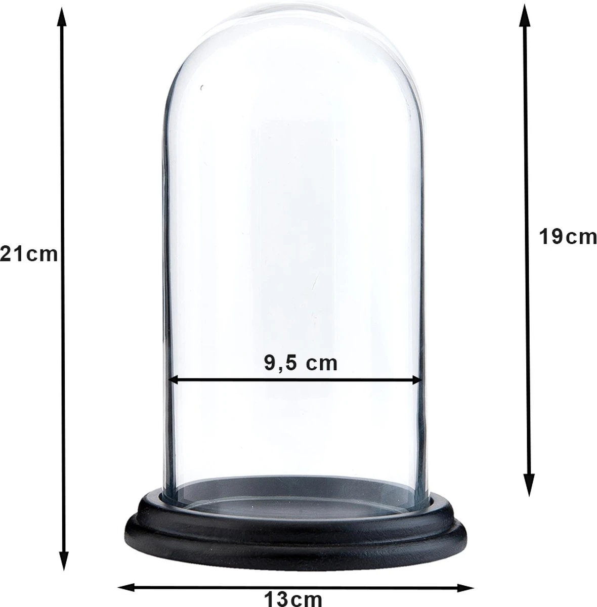 De glazen bel is 21 cm in hoogte (incl. de basis) en heeft een totale basis diameter van 13 cm. De binnen diameter van het glas is 9,5 cm en hoogte van het glas is 19 cm. Glazen stolp Woon decoratie Woonaccessoires