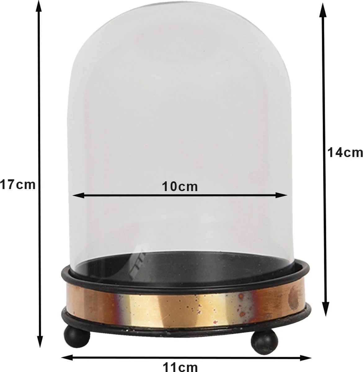 De glazen bel is 17 cm in hoogte (incl. de basis) en heeft een totale basis diameter van 11 cm. De binnen diameter van het glas is 10 cm en hoogte van het glas is 14 cm. Glazen Stolp Stolp op Voet