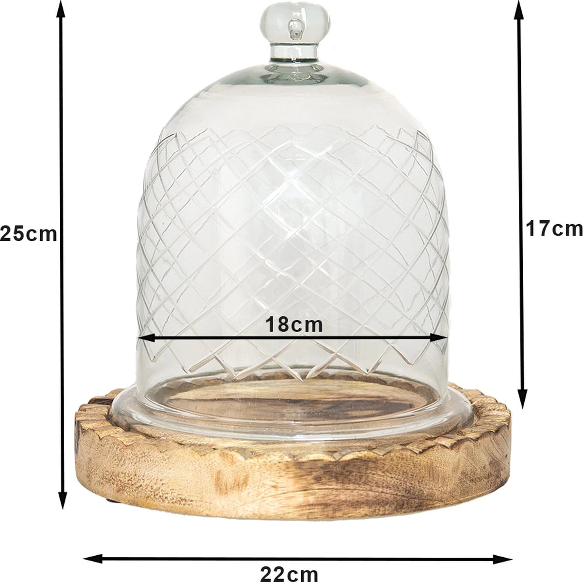 DECORATIEF GLAZEN STOLP: Onze glazen bel is 25 cm in hoogte (inclusief de basis) en heeft een totale basis diameter van 22 cm. De binnen diameter van het glas is 18 cm. De totale hoogte van het glas (exclusief basis) is 17 cm.
