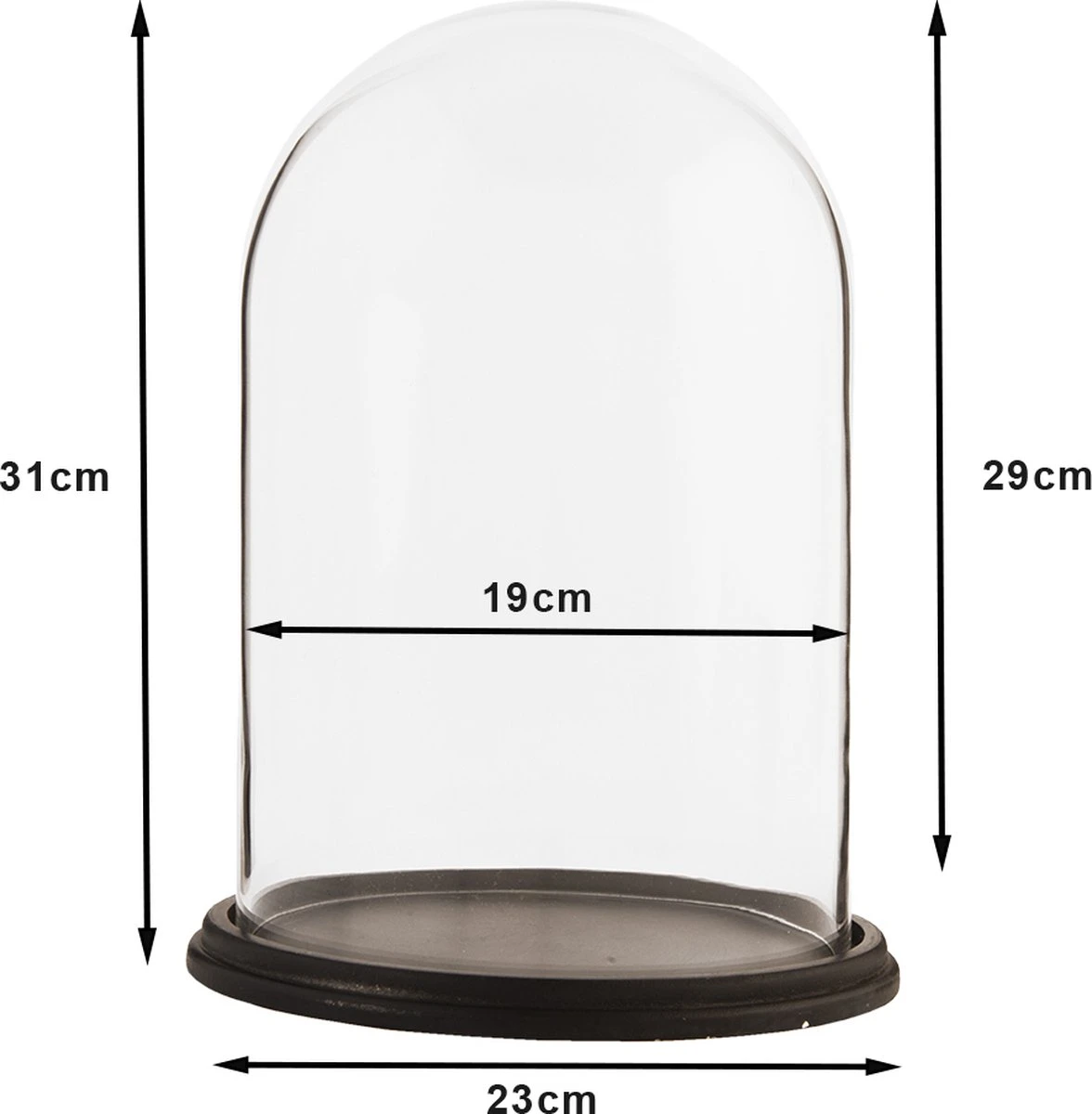 De glazen bel is 31 cm in hoogte (incl. de basis) en heeft een totale basis diameter van 23 cm. De binnen diameter van het glas is 20 cm en hoogte van het glas is 29 cm. Glazen Stolp