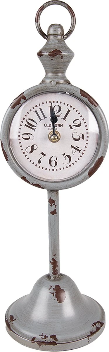 Mooie grijze landelijke tafelklok van metaal met een witte wijzerplaat en romeinse cijfers van het merk Clayre & Eef. De wijzerplaat is Ø 10 cm en werkt op 1x AA. Tafelklokken Binnen Staand Klokje Tafelklokje