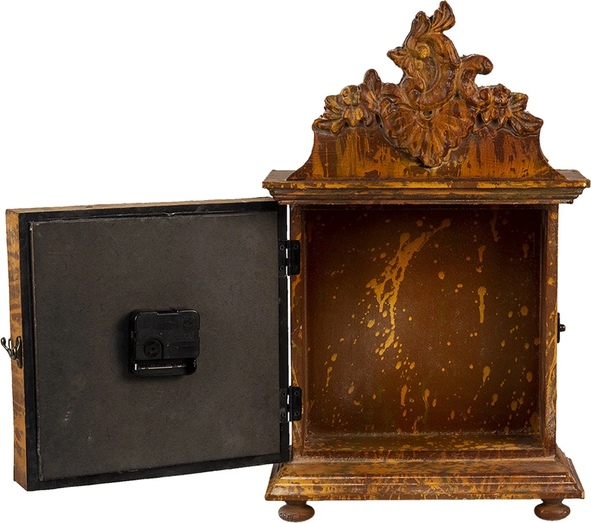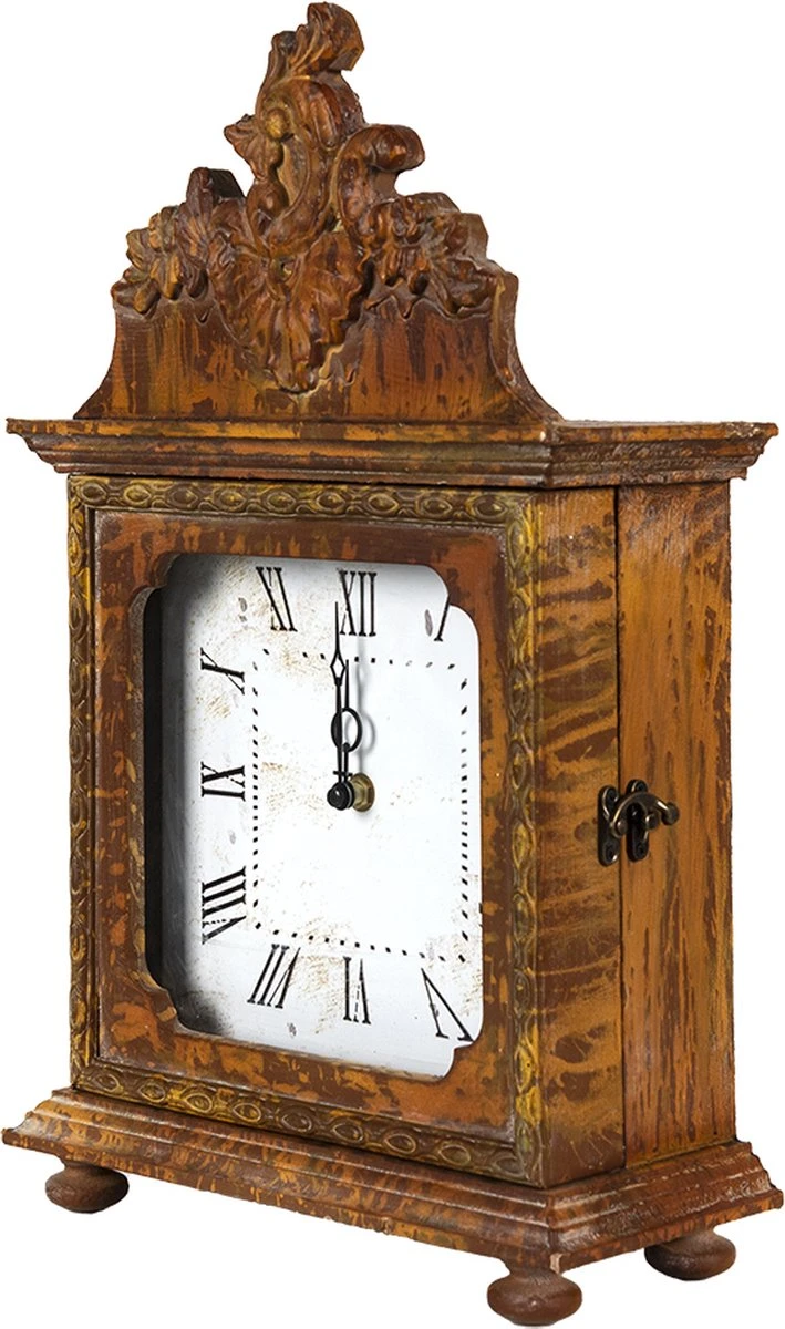 Klassieke bruine houten tafelklok met Romeinse cijfers van het merk Clayre & Eef. Deze klok heeft een opberg ruimte. Ook maakt deze klok geluid Tafelklokken Binnen Staand Klokje Tafelklokje
