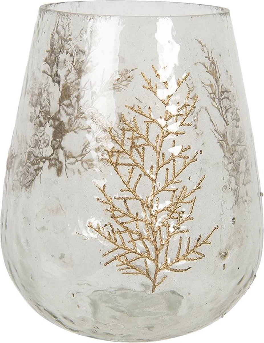 Theelichthouder van transparant glas met goudkleurig motief van takken, in elegante stijl met een romantische uitstraling.