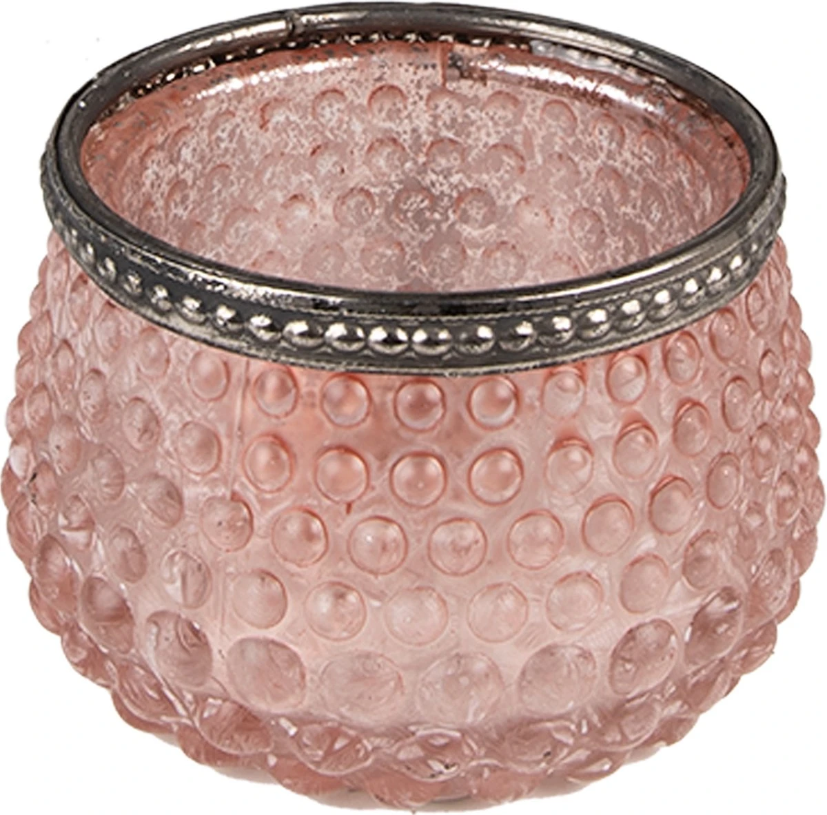 Roze theelichthouder, versiert met een metalen randje, in romantische stijl met een landelijke uitstraling. Waxinelichthouder Windlichthouder