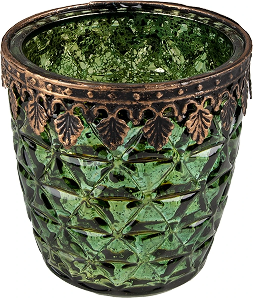 Groene theelichthouder, versiert met een metalen randje, in romantische stijl met een landelijke uitstraling. Waxinelichthouder Windlichthouder