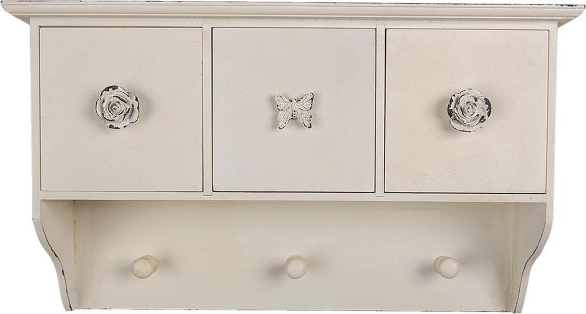 Kapstok met 3 lades en 3 haken in landelijke stijl in gebroken wit met een vlinder motief van het merk Clayre & Eef.