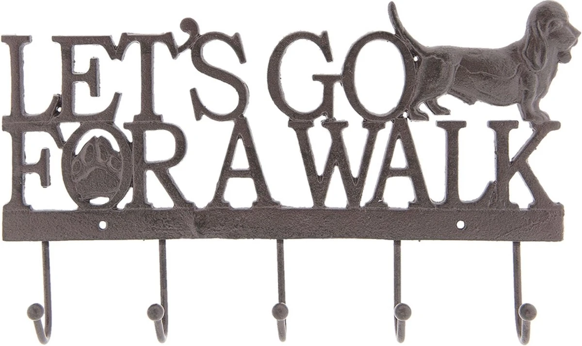 Bruin metalen landelijke kapstok met een hond en de tekst ‘Let’s go for a walk’ van het merk Clayre & Eef