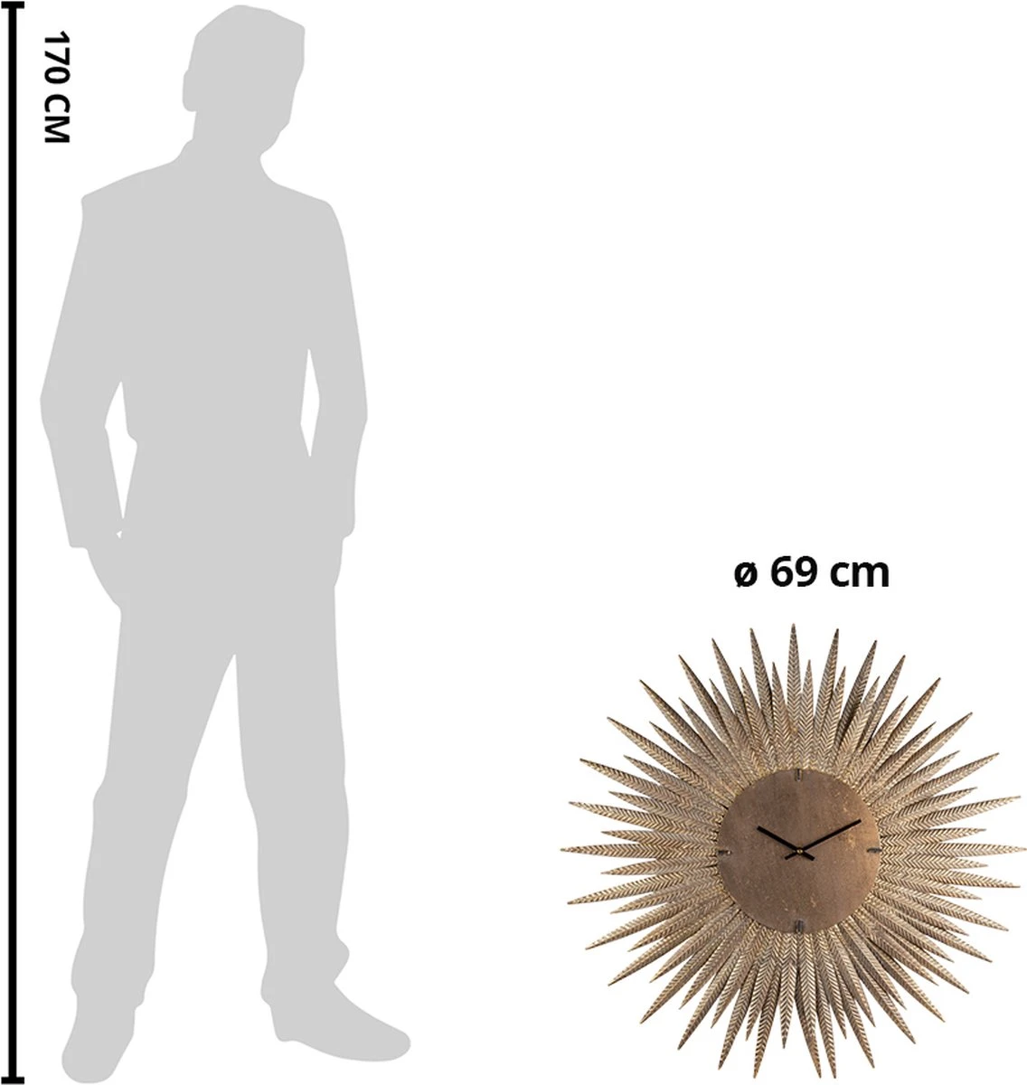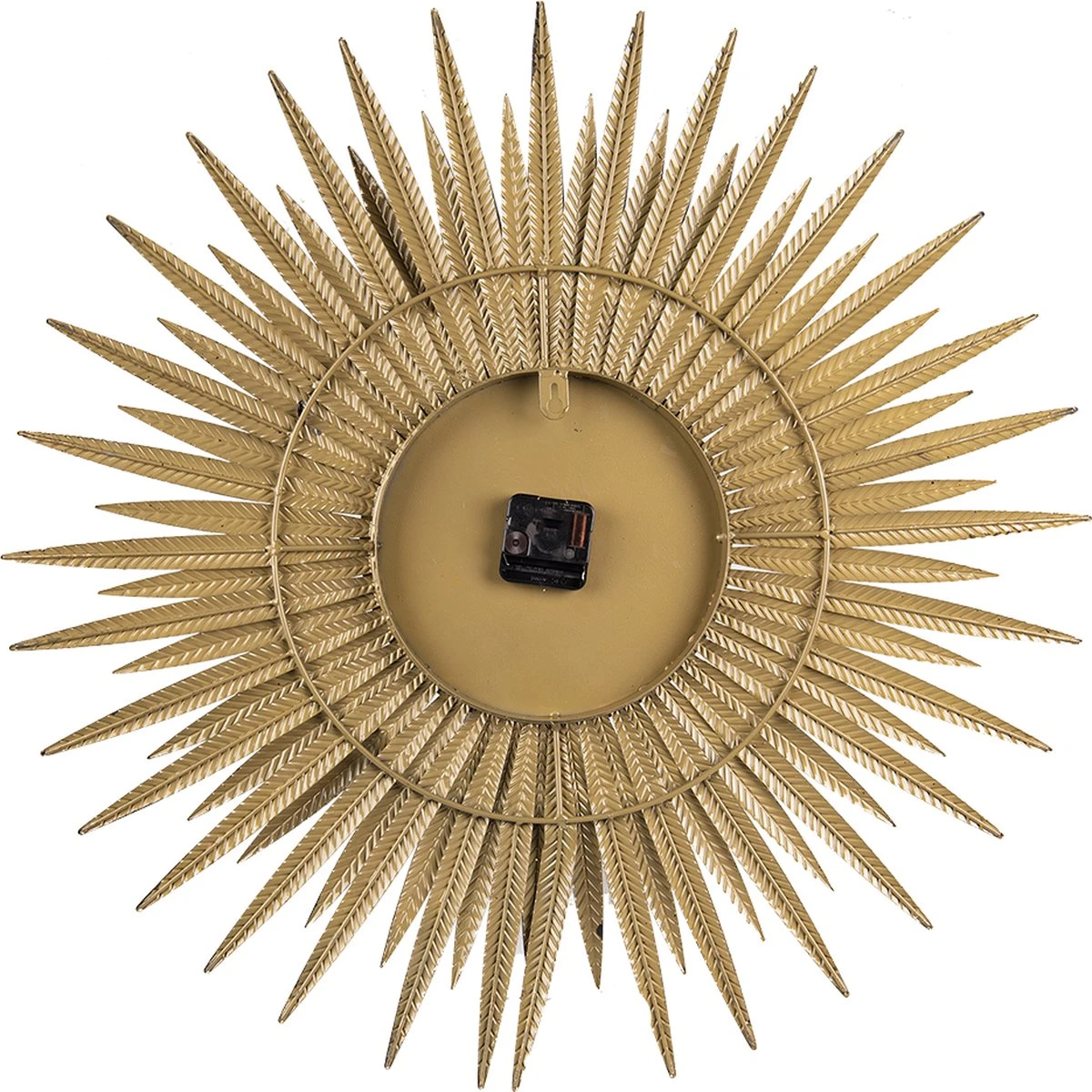 Mooie koperkleurige ronde wandklok met een vintage uitstraling van het merk Clayre & Eef. De afmeting is Ø 69×4 cm. Het uurwerk werkt op 1x AA batterij. Muurklok Hangklok Keukenklok