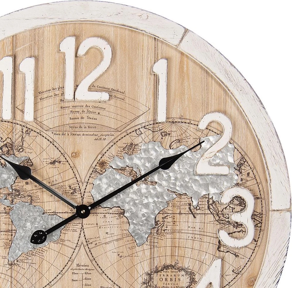Deze houten wandklok met cijfers van het merk Clayre en Eef is een landelijke klok mett een wereldkaart design Deze vintage klok met een diameter van 70 cm is prachtig vormgegeven en is uitgerust met een precisie-uurwerk voor nauwkeurigheid.Met de ui