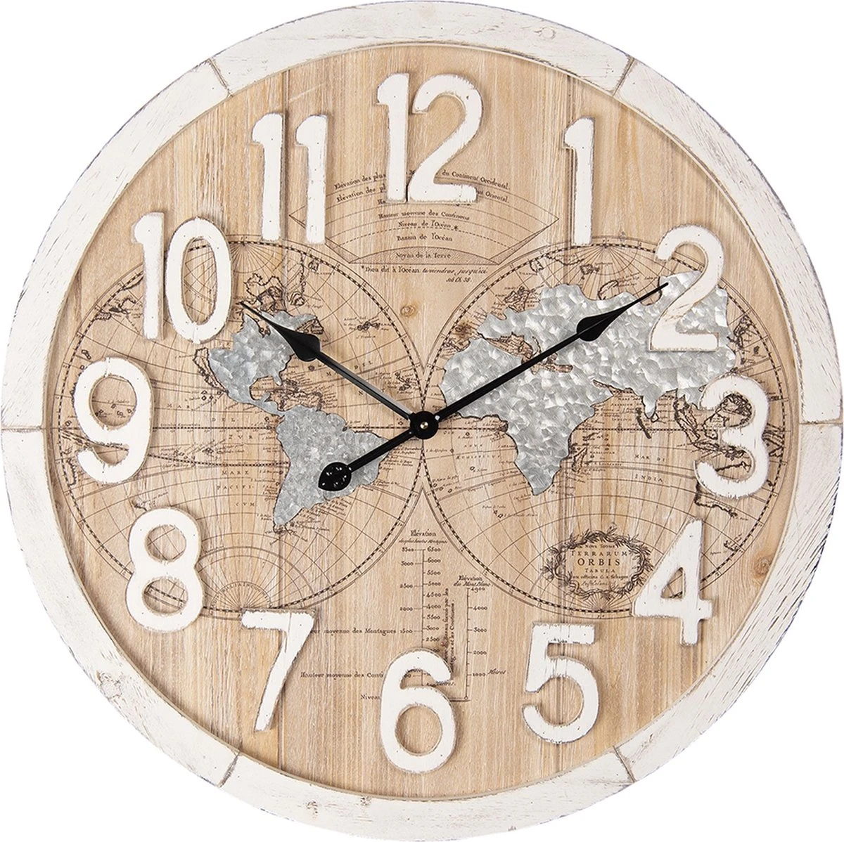 Bruin houten landelijke klok met cijfers en wereldkaartmotief van het merk Clayre & Eef.