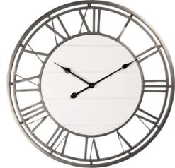 Grijze houten klok met metalen rand en romeinse cijfers van het merk Clayre & Eef Muurklok Hangklok Keukenklok