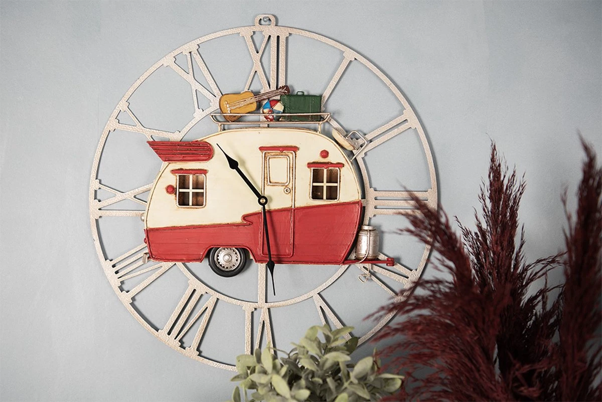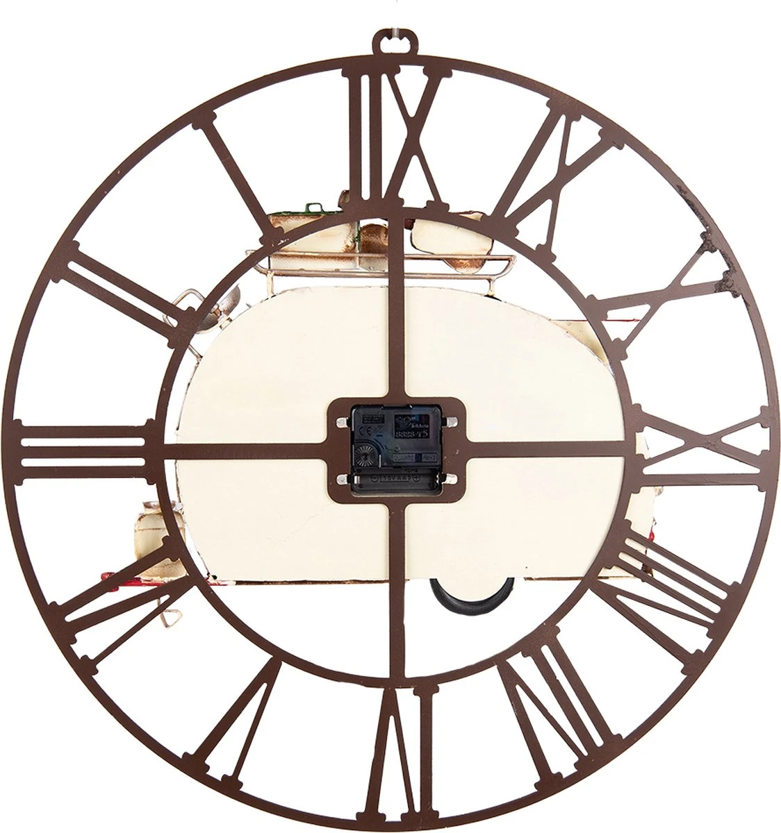 Mooie metalen retro ronde wandklok in de kleuren rood, bruin en wit met romeinse cijfers en een afbeelding van een caravan. De klok heeft een doorsnede van 48 cm met een haakje van 2 cm eraan en werkt op 1x AA batterij. Muurklok Hangklok