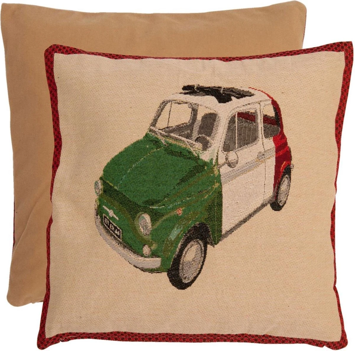 Wees ook origineel en gooi dit charmante Sierkussen Fiat van het meubelmerk Clayre en Eef op jouw bed of bank. En op de vensterbank of op het dressoir kan natuurlijk ook. Op de voorkant van het bruine kussentje is een Fiat 500 afgebeeld in de kleuren van de Italiaanse vlag. Erg leuk accent is de rood gestippelde bies. Dit product betreft het complete kussen, dus zowel de katoenen kussenhoes als de binnenvulling. Een retro sierkussen van 40 bij 40 cm. dat voor een hele eigen en unieke sfeer zorgt in jouw interieur.