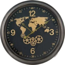 Clayre & Eef Wandklok Ø 64 Cm Zwart Goudkleurig MDF Ijzer Rond Wereld Muurklok Hangklok Keukenklok